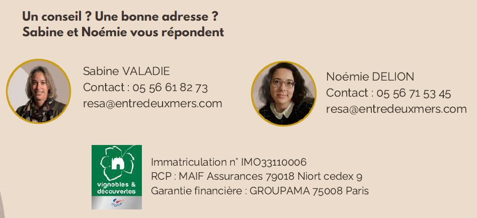 Entre-deux- Mers Tourisme conçoit depuis plus de 20ans des séjours de qualité pour les groupes et les individuels. Nous disposons d’une immatriculation qui nous permet de commercialiser des forfaits touristiques sur notre territoire. Nous avons toutes les assurances nécessaires pour organiser votre circuit en toute sécurité.